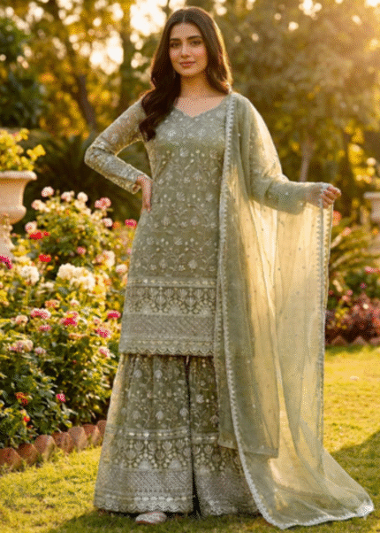 Designer GMY Silk Embroidered Top Sharara Set with Lace Border Dupatta
